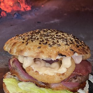 doppio hamburger, lattuga, pomodori secchi, gorgonzola, pancetta, cipolla Tropea, maionese e ketchup.