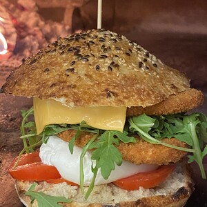 Doppia cotoletta, cheddar, pomodoro a fette, rucoletta, burrata, patate al forno e salsa rosa.